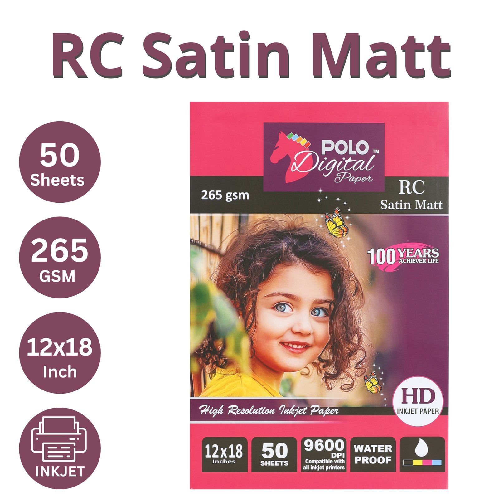 RC Satin Matt High Resolution Inkjet Photo Paper 12×18 Inch 265 GSM 9600 DPI 50 Sheets Water Proof – Product Highlights: